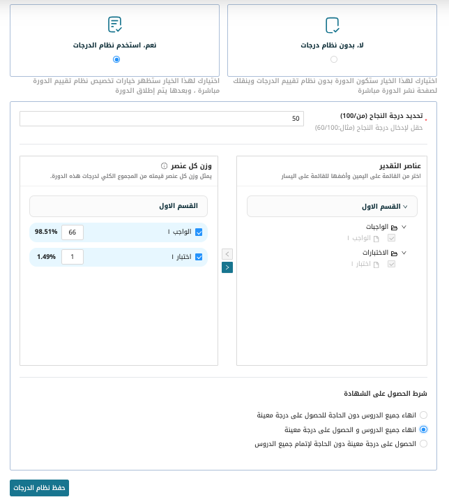 لكل دورة تعليمية طريقة تقييم مختلفة. يمكنك اختيار استخدام نظام درجات لتقييم أداء الطلاب في أي من الدورات، كما يمكنك اختيار إضافة دورة تعليمية بدون استخدام نظام درجات لتقييم أداء الطلاب. لا يمكن إضافة نظام للدرجات مع الدورة ما لم يكن تم إضافة واجبات واختبارات مع الدروس التعليمية في تلك الدورة حيث يتم توزيع الدرجات على أساس تلك التكليفات سواء الواجبات او الاختبارات.