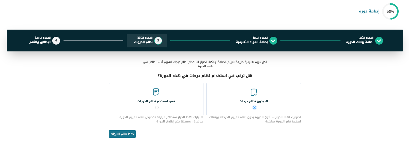1. في نموذج «إضافة دورة» وفي الخطوة الثالثة تحت عنوان «نظام الدرجات» حدد إذا كنت تريد استخدام نظام للدرجات مع هذه الدورة أم تريدها بدون نظام للتقييم.