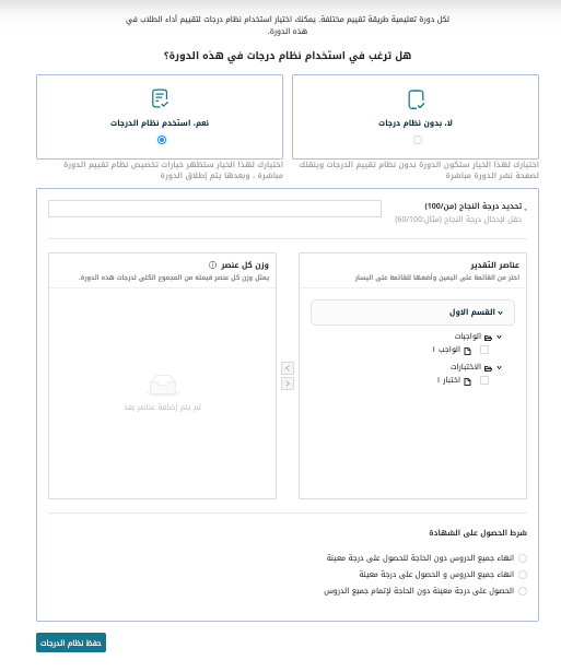 2. في نموذج نظام الدرجات، إذا كنت تريد تخصيص نظام للدرجات والتقييم لهذه الدورة، حدد الخيار «نعم استخدام نظام للدرجات» لاستكمال باقي بيانات نظام الدرجات.