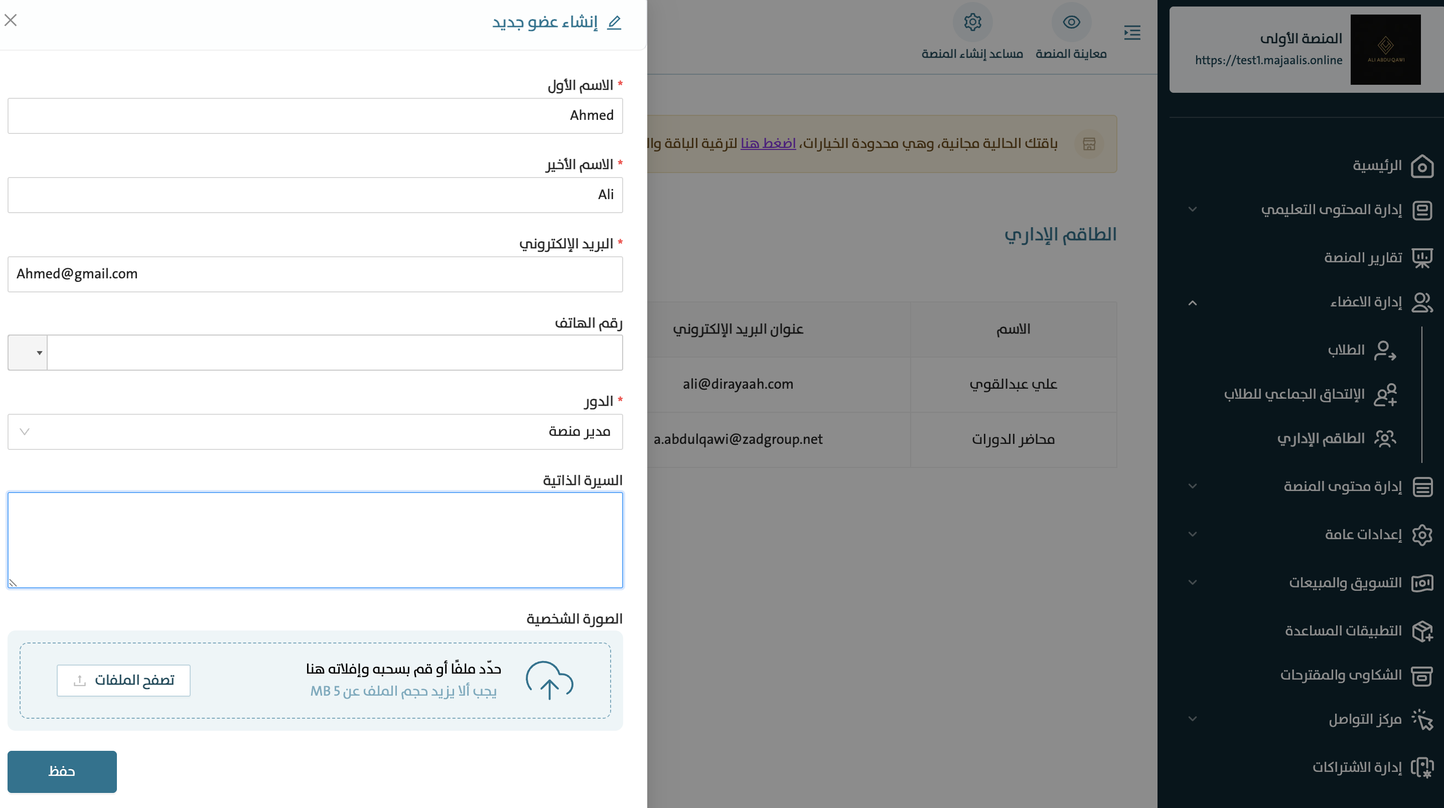 ادخل المعلومات اللازمة لتسجيل العضو الجديد في الطاقم الإداري.
