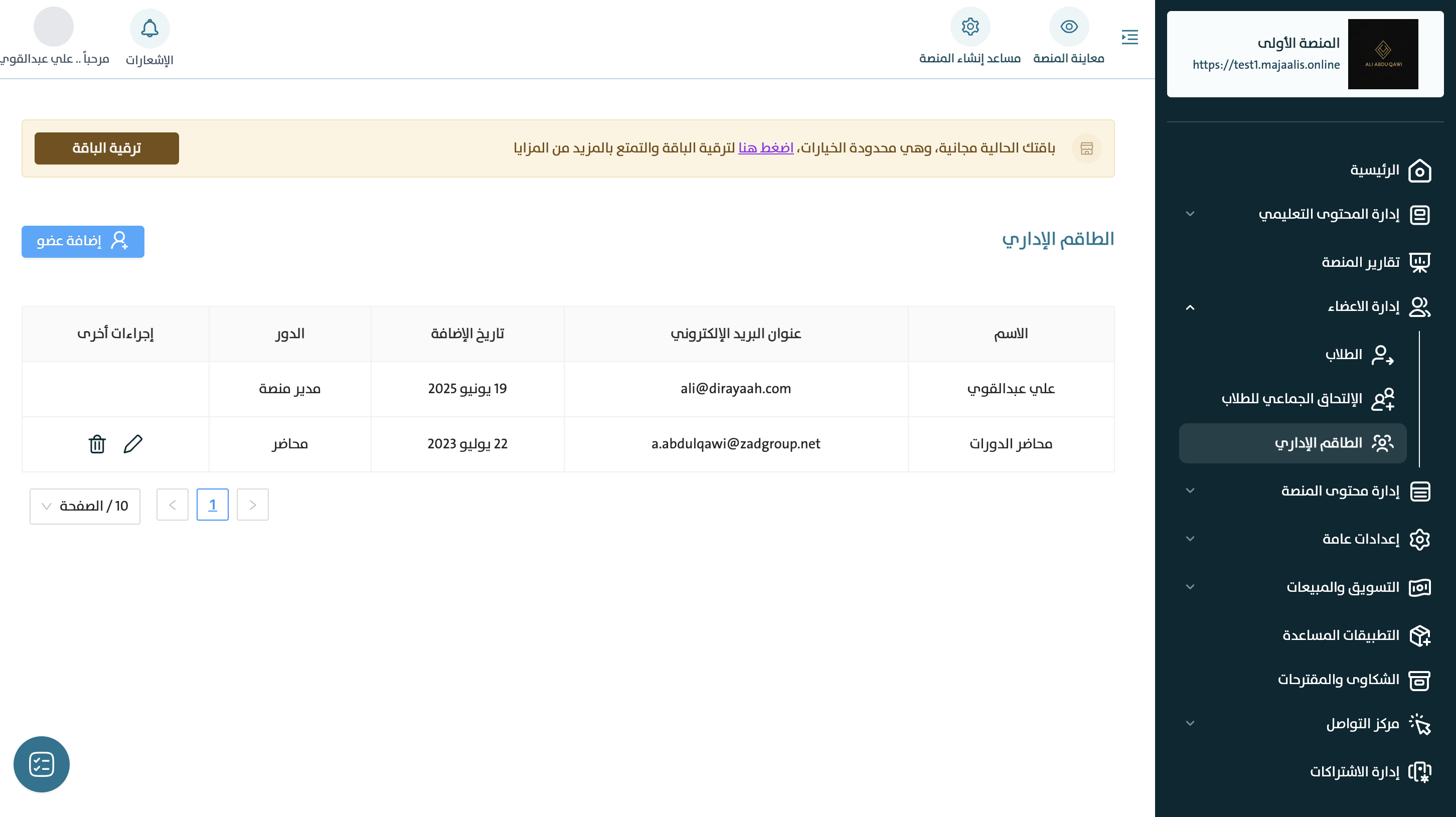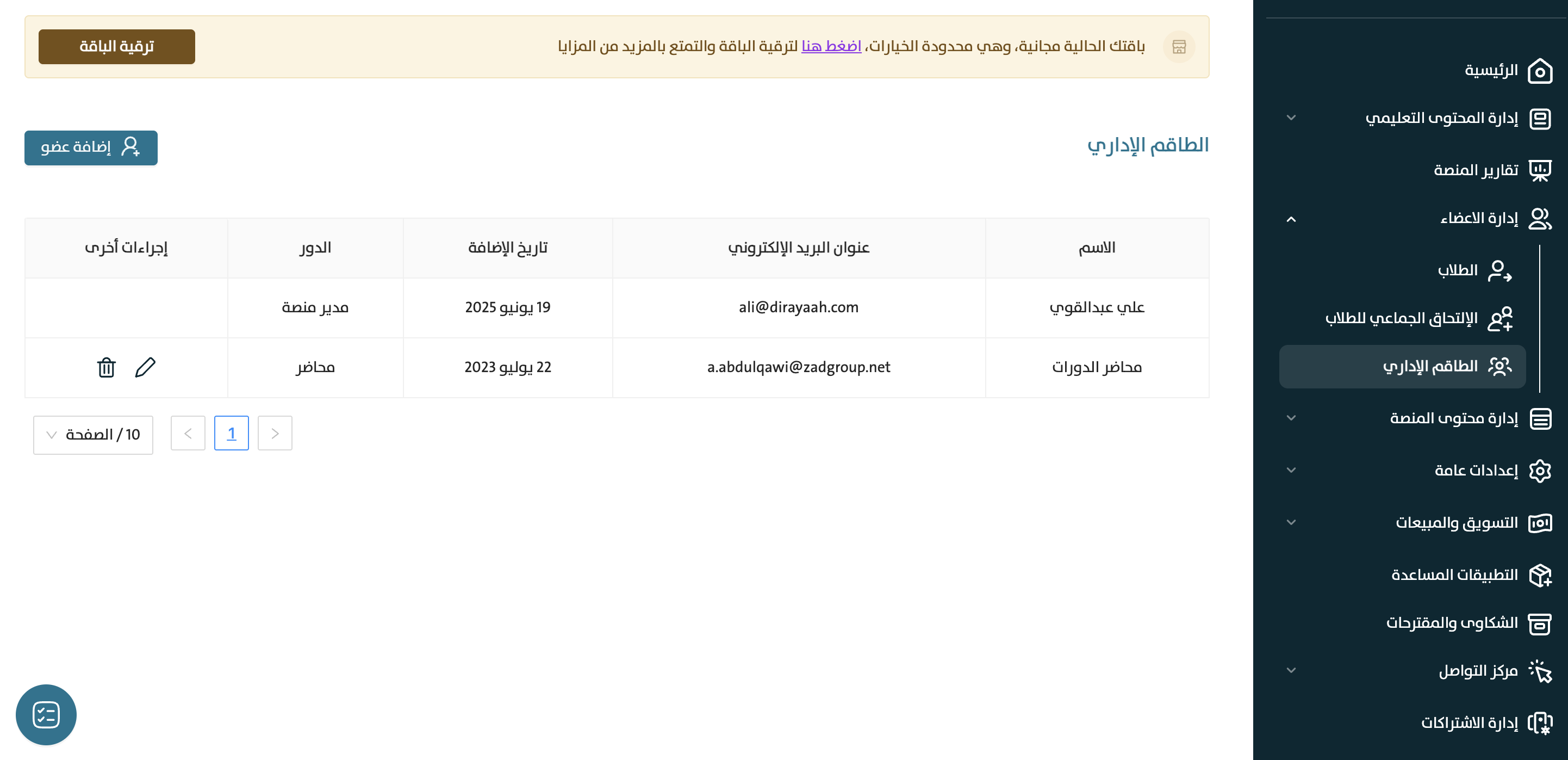 1- في قائمة لوحة التحكم بالصفحة الرئيسية للمنصة، اضغط فوق رابط «إدارة الأعضاء» > «الطاقم الإداري» للانتقال مباشرة لصفحة الطاقم الإداري؛ حيث يكون معروضًا بشكل افتراضي كل الطاقم الإداري المضافين سابقًا في المنصة ، مع عدة اختيارات.