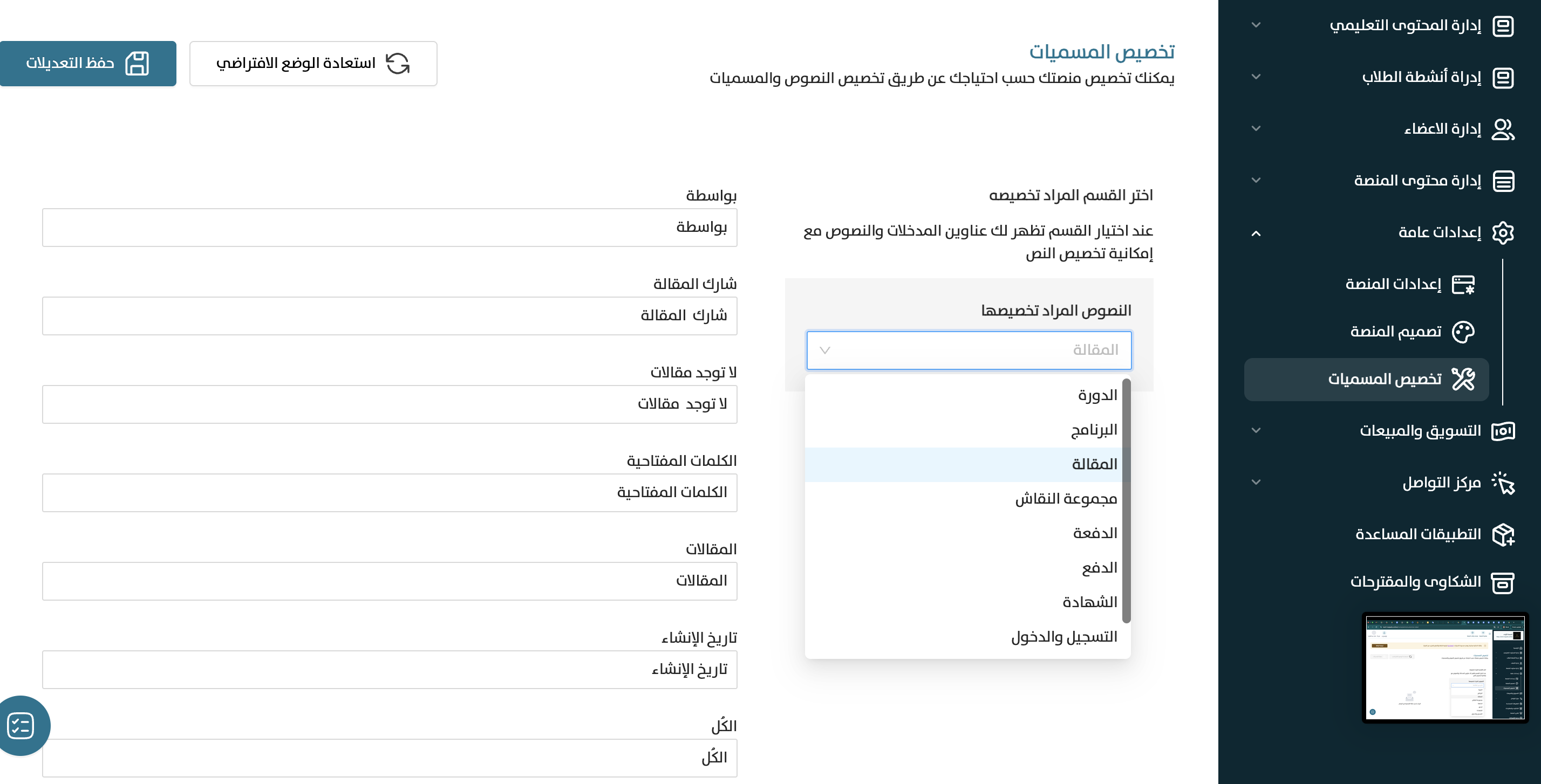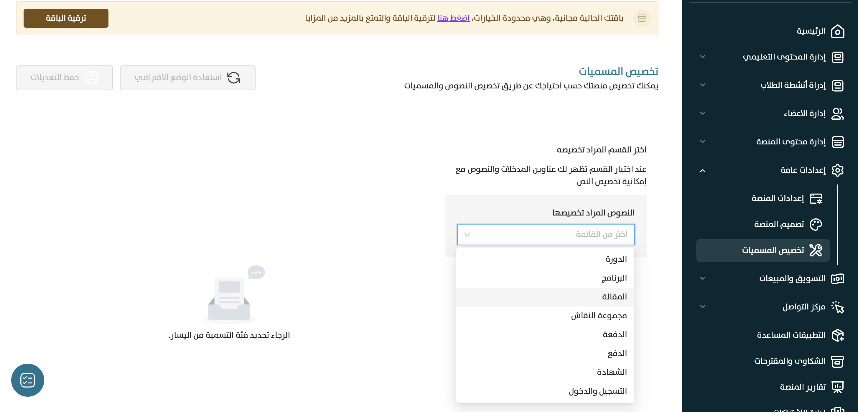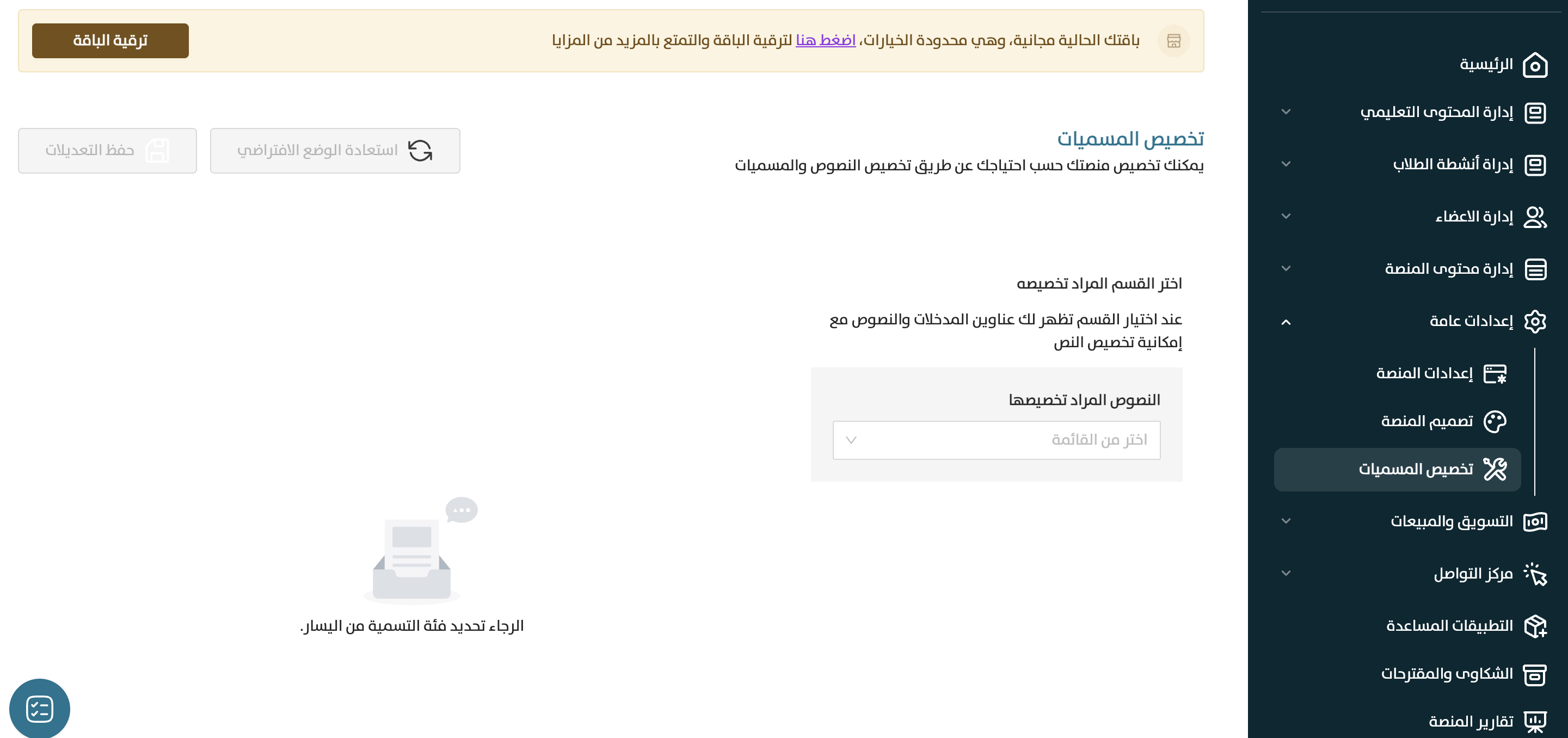 1- في قائمة لوحة التحكم بالصفحة الرئيسية للمنصة، اضغط فوق رابط «إعدادات عامة» > «تخصيص المسميات» للانتقال مباشرة لصفحة تخصيص المسميات؛ حيث يكون معروضًا بشكل افتراضي مسميات المنصة.
