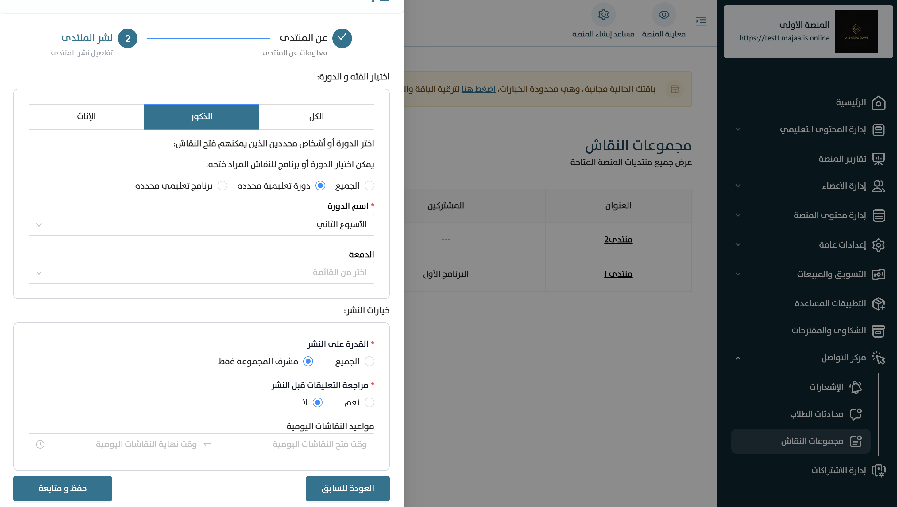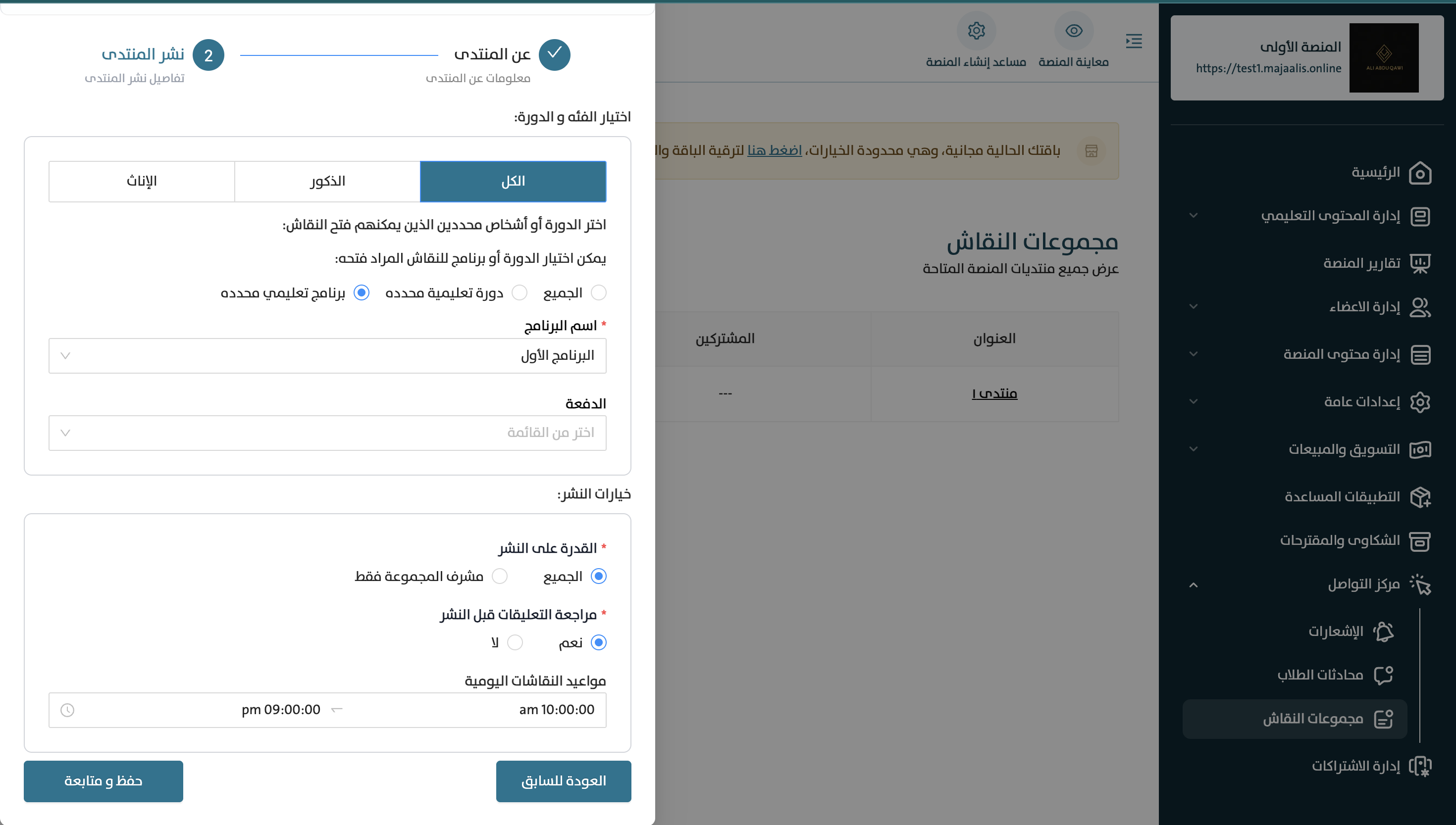 في خطوة "نشر المنتدى"، يمكنك تحديد الفئة المستهدفة وربط المنتدى بالمحتوى التعليمي: