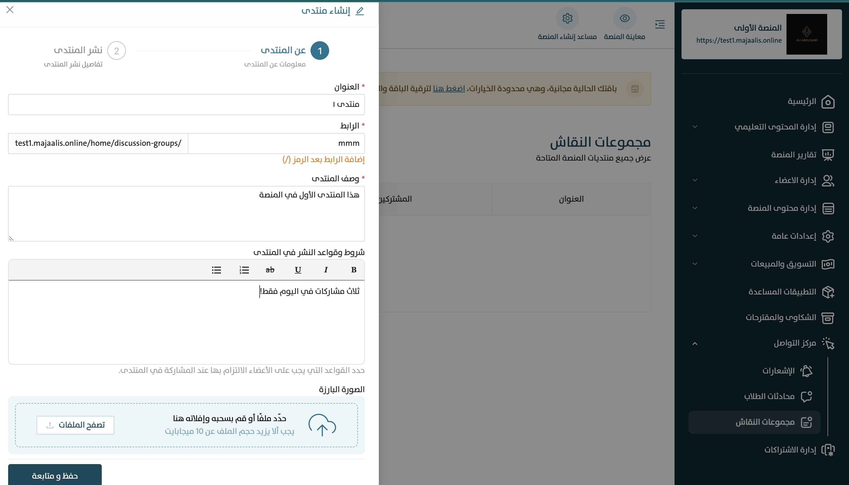 - الصورة البارزة (اختياري): رفع صورة تظهر في واجهة المنتدى.