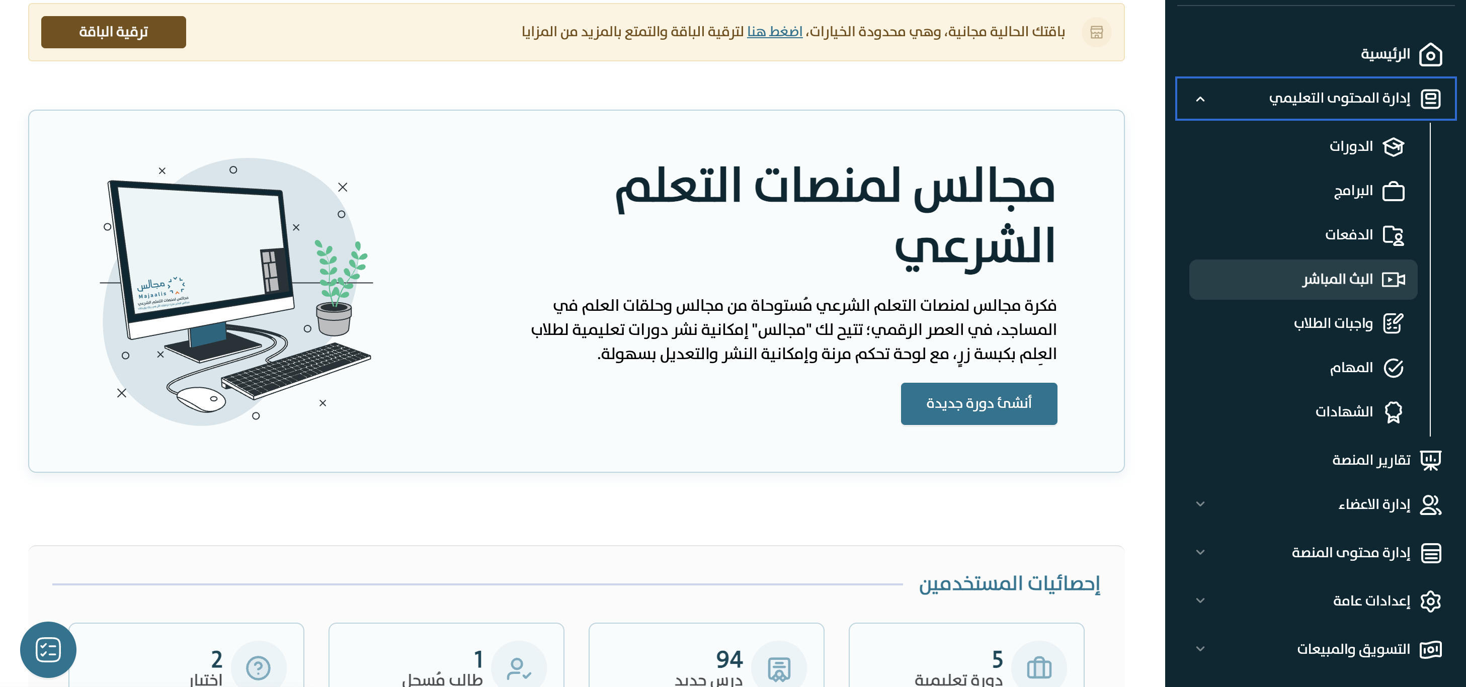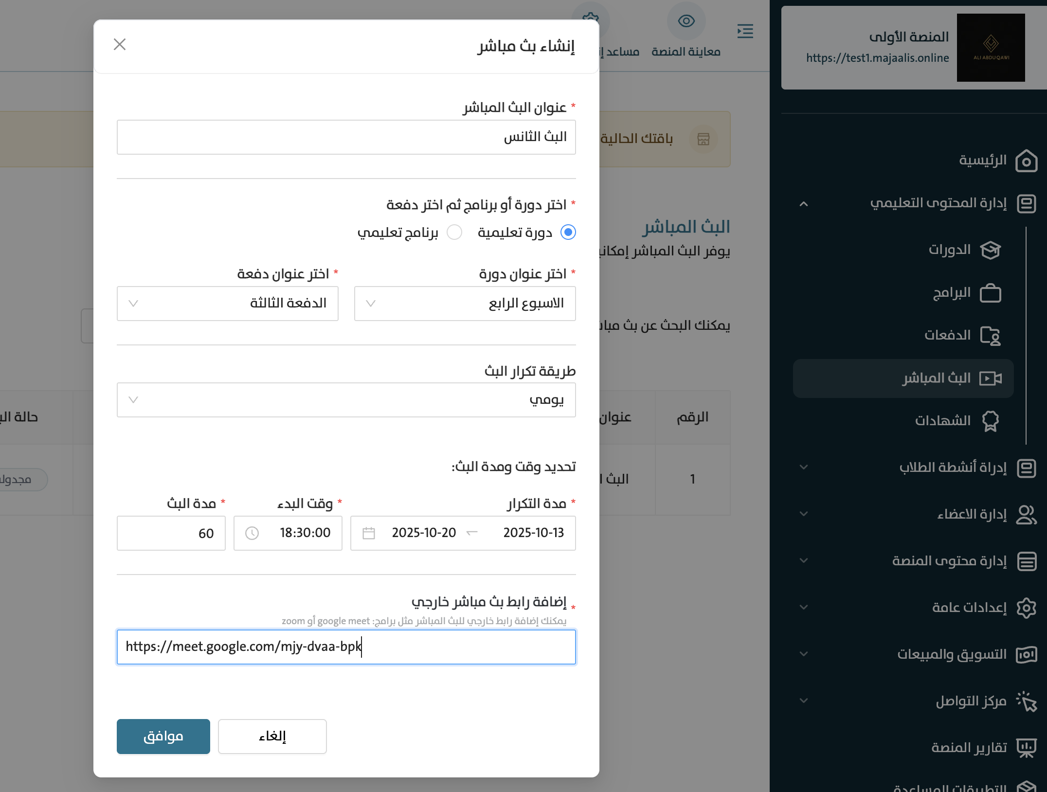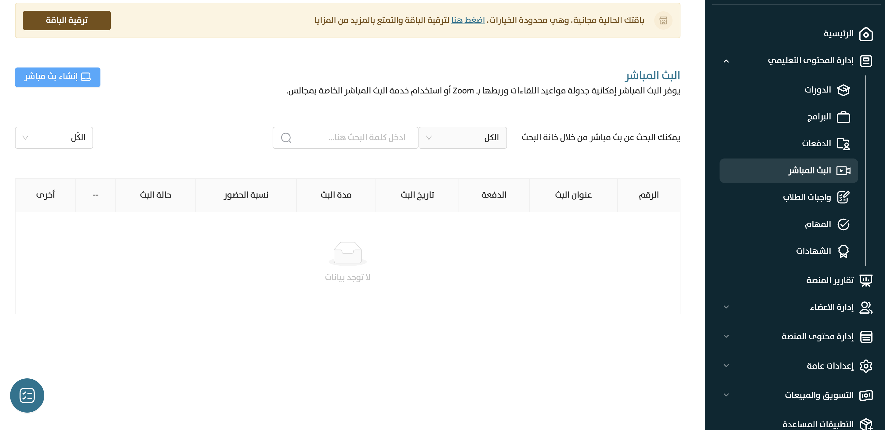 - إطلاق المحاضرات المباشرة: يمكن للمحاضرين جدولة جلسات بث مباشر وربطها بالدورات /البرامج التعليمية.