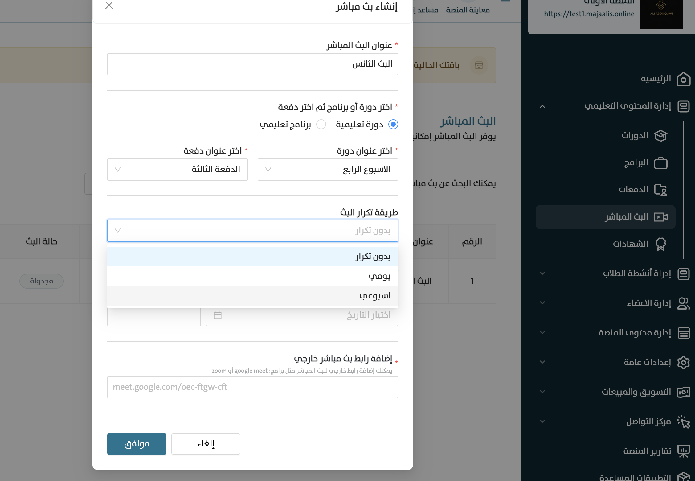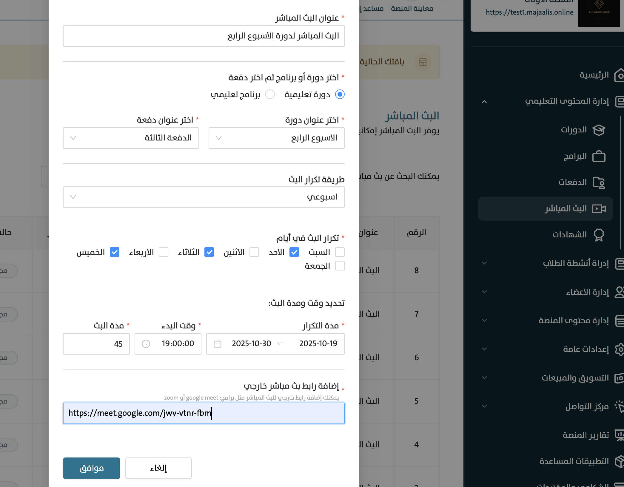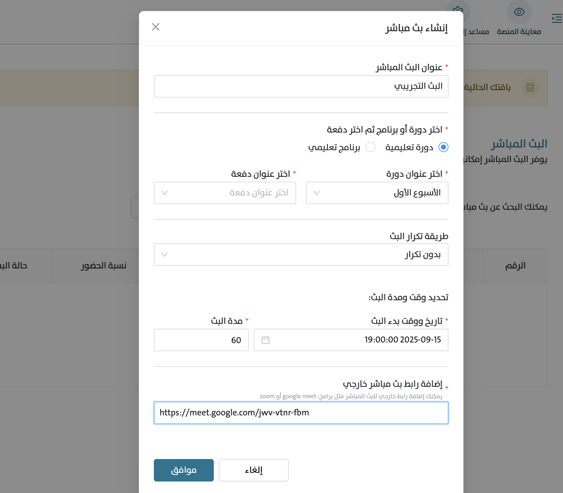 - ويمكن استخدام الرابط الخارجي المباشر لإضافة روابط بث من منصات أخرى مثل Google Meet أو Zoom أو غيرها.