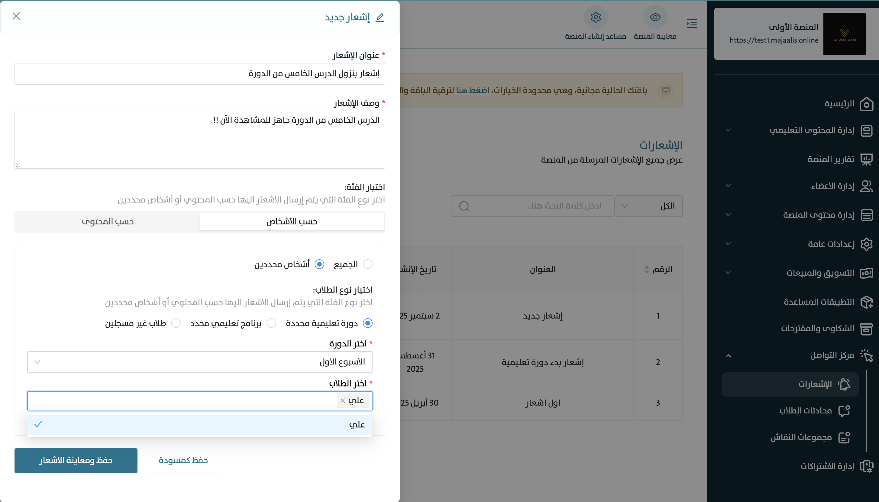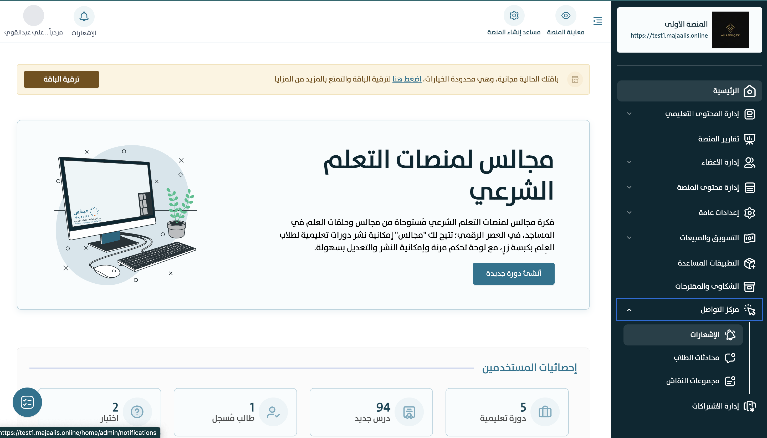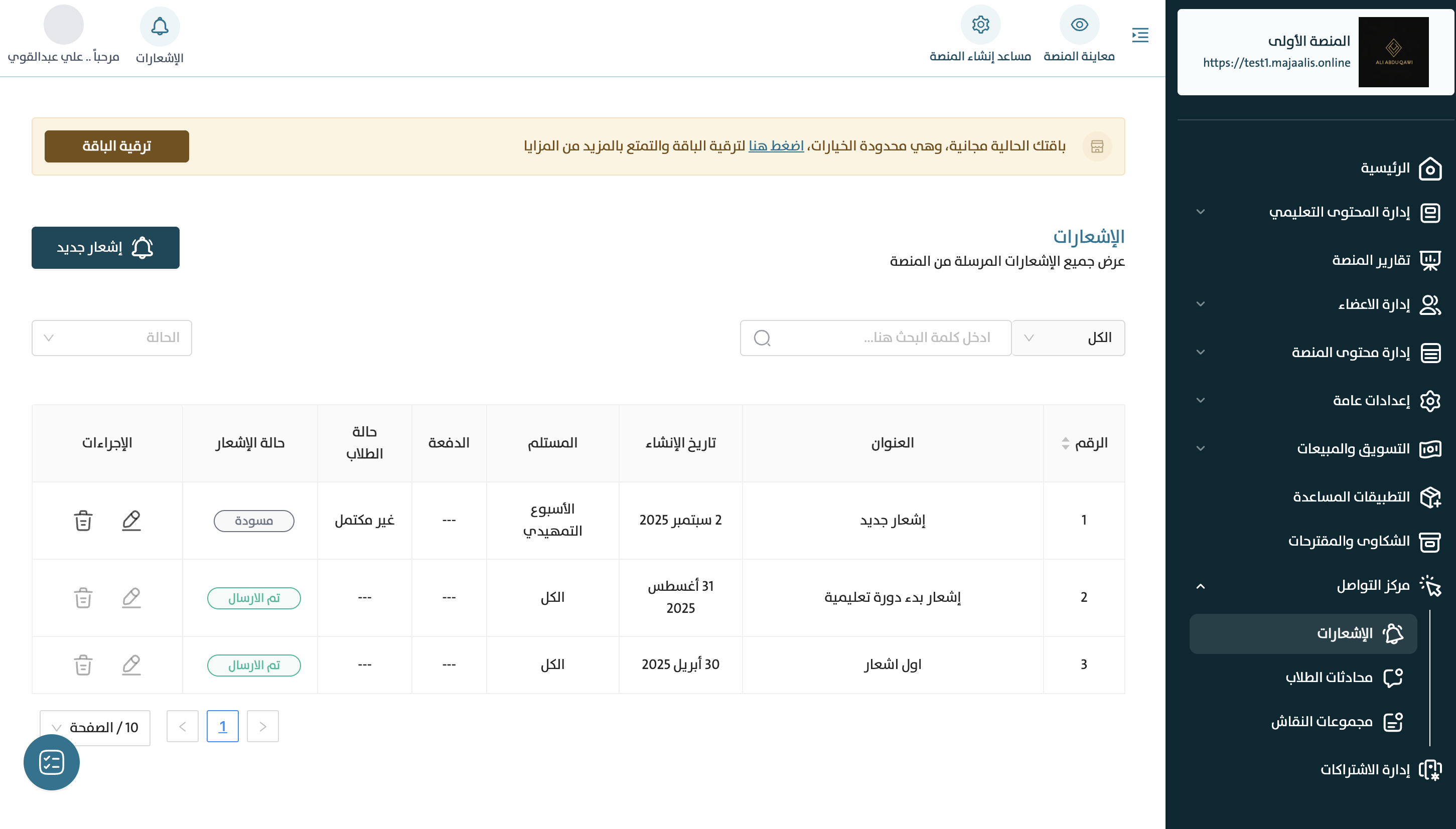 1- في قائمة لوحة التحكم بالصفحة الرئيسية للمنصة، اضغط فوق رابط «مركز التواصل» > «الاشعارات» للانتقال مباشرة لصفحة الاشعارات؛ حيث يكون معروضًا بشكل افتراضي كل الاشعارات المضافة سابقًا في المنصة.