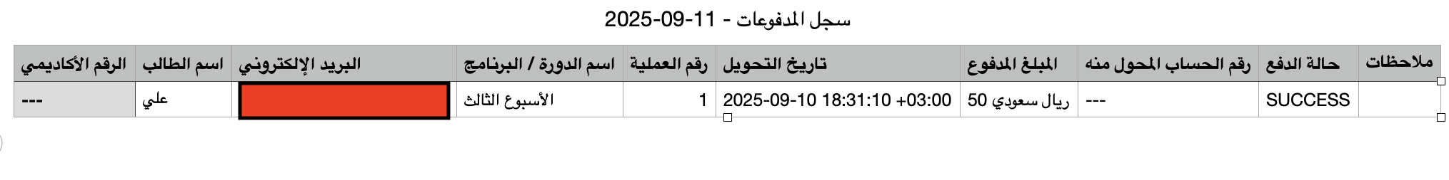 وعند الضغط على زر «تصدير البيانات» يتم تنزيل ملف سجل المدفوعات بهذا الشكل.