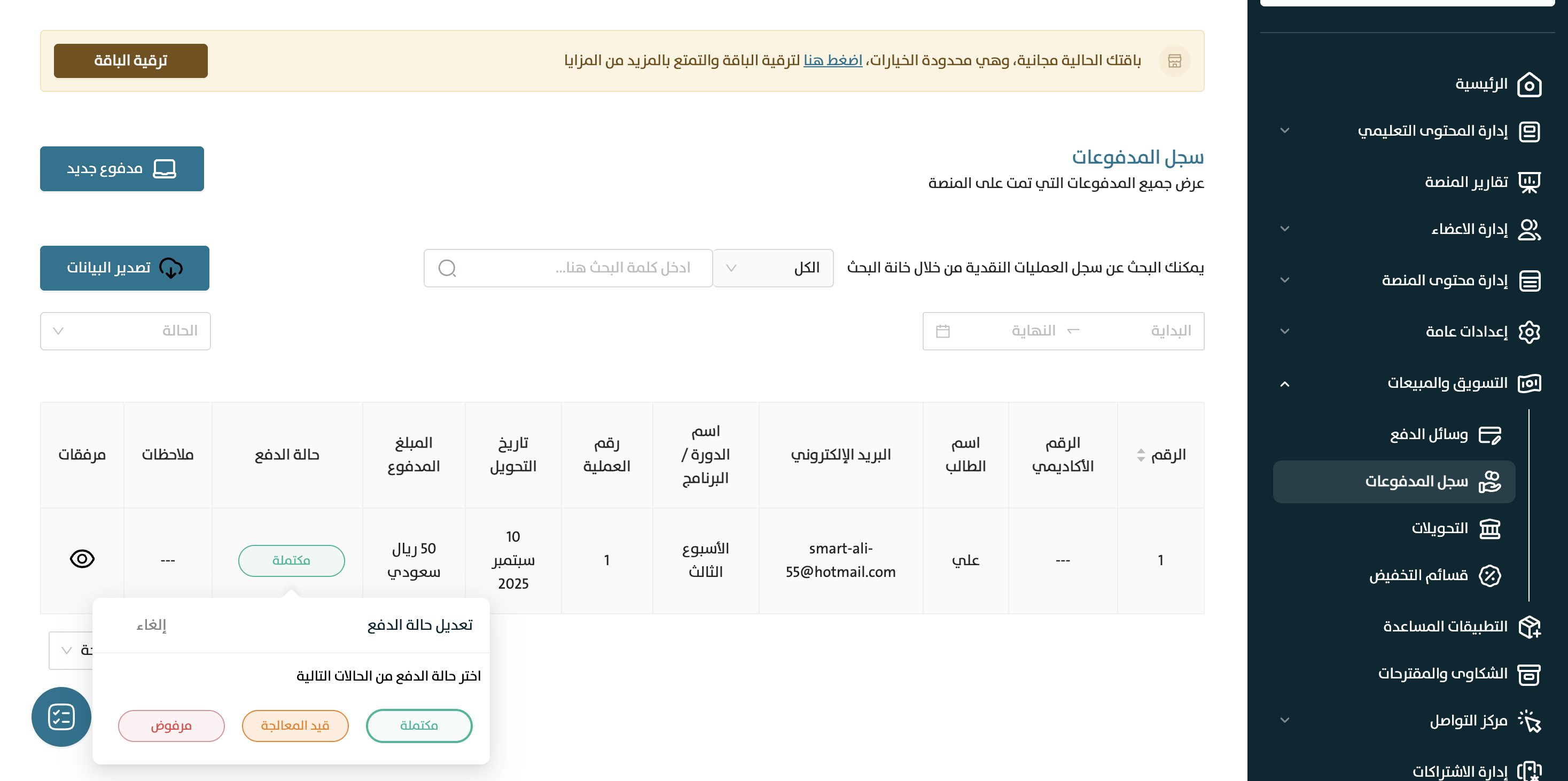 5- تستطيع التعديل على حالة الدفع من الاختيارات المتاحة وذلك في حالة المدفوعات اليدوية حيث يتيح هذا الخيار التأكد من المدفوعات قبل دخول الطالب إلى الدورات أو البرامج المدفوعة
