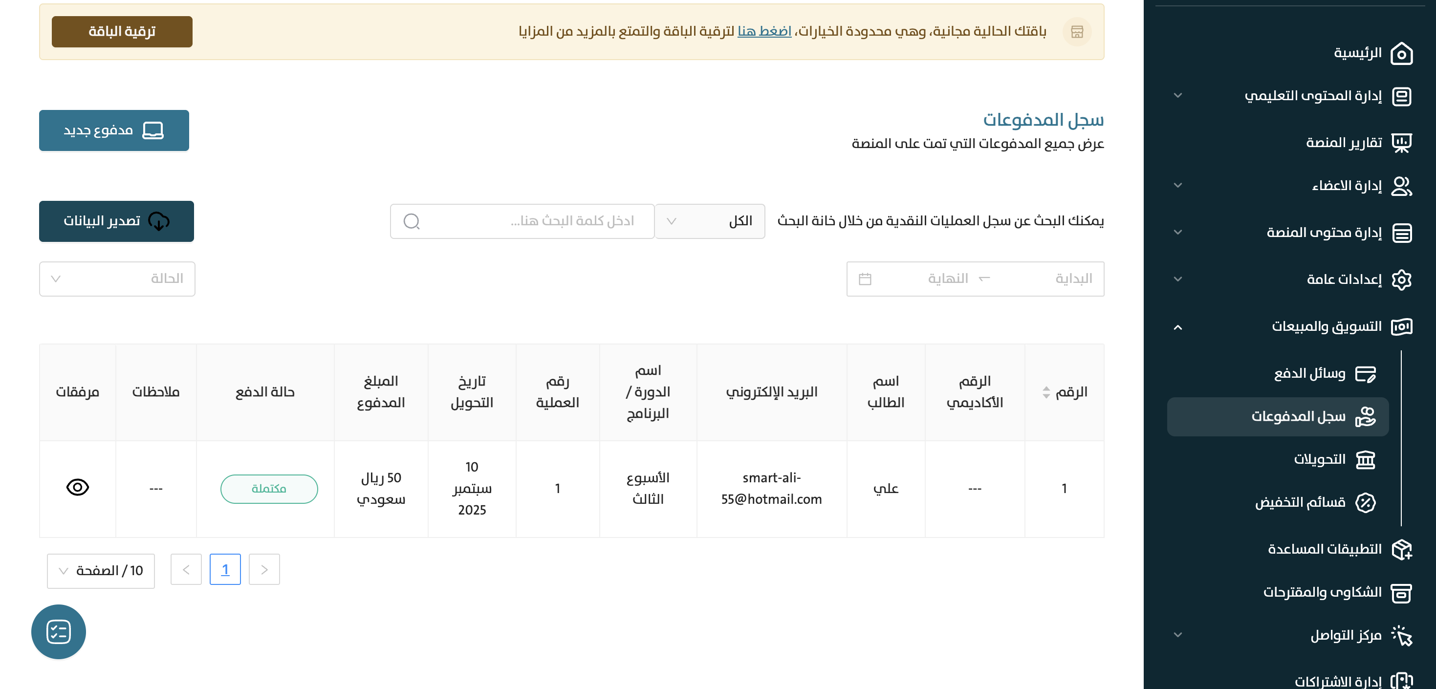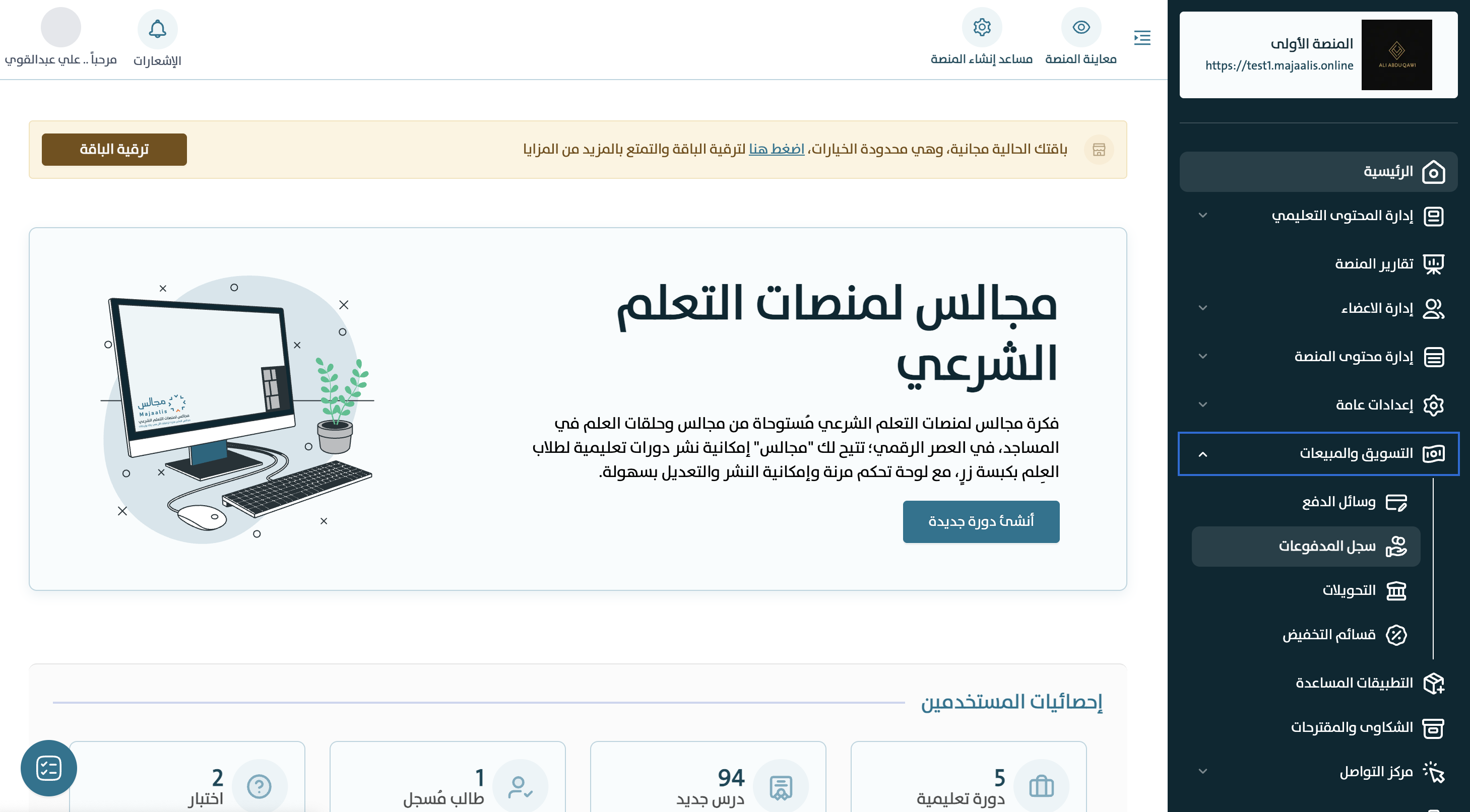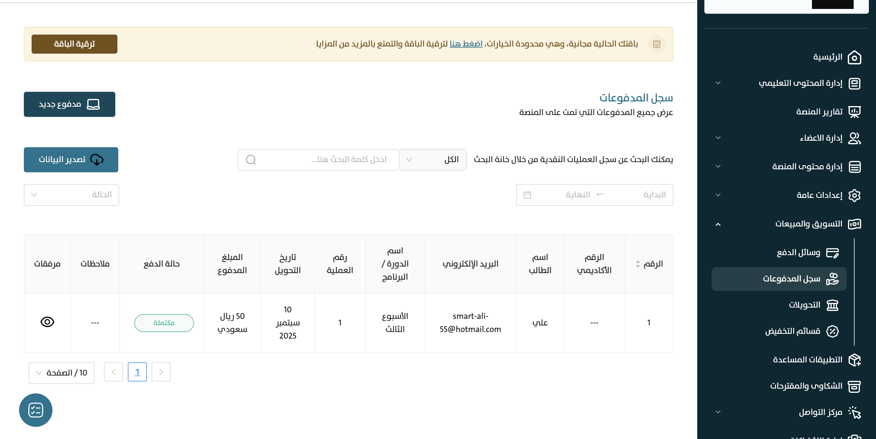 1- في قائمة لوحة التحكم بالصفحة الرئيسية للمنصة، اضغط فوق رابط «التسويق والمبيعات» > «سجل المدفوعات» للانتقال مباشرة لصفحة المدفوعات؛ حيث يكون معروضًا بشكل افتراضي كل المدفوعات المضافة سابقًا في المنصة عبر وسائل الدفع المختلفة سواء كانت عن طريق بوابات الدفع أو الدفع اليدوي.