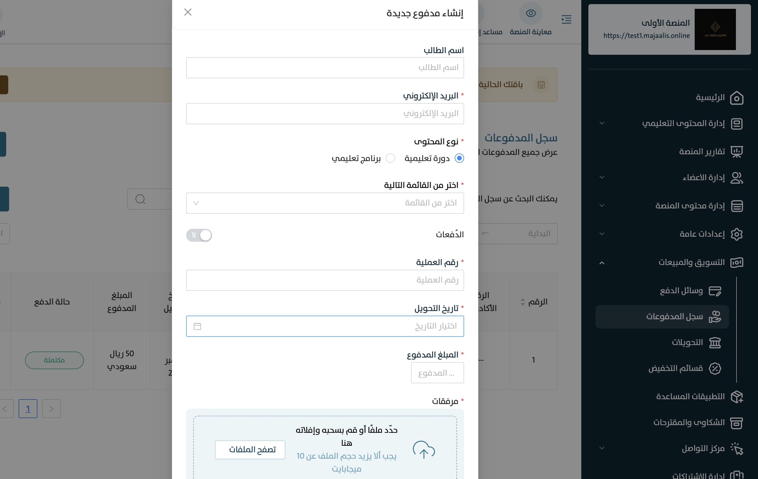 أما إذا حدثت عملية دفع من خارج المنصة يتم إدخاله عن طريق مدفوع جديد