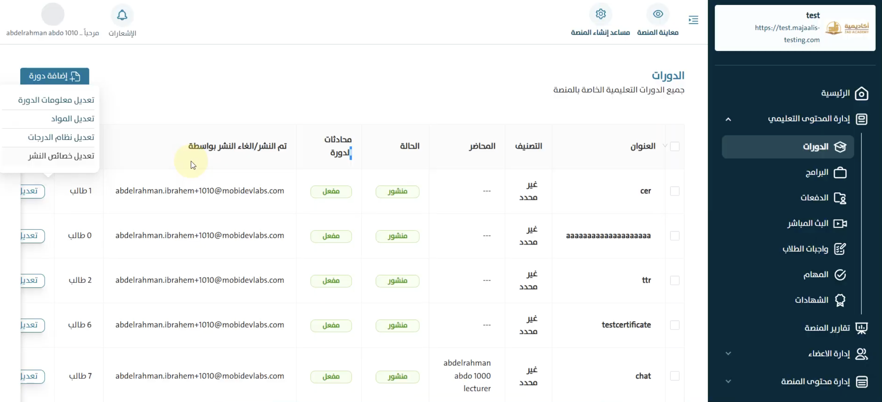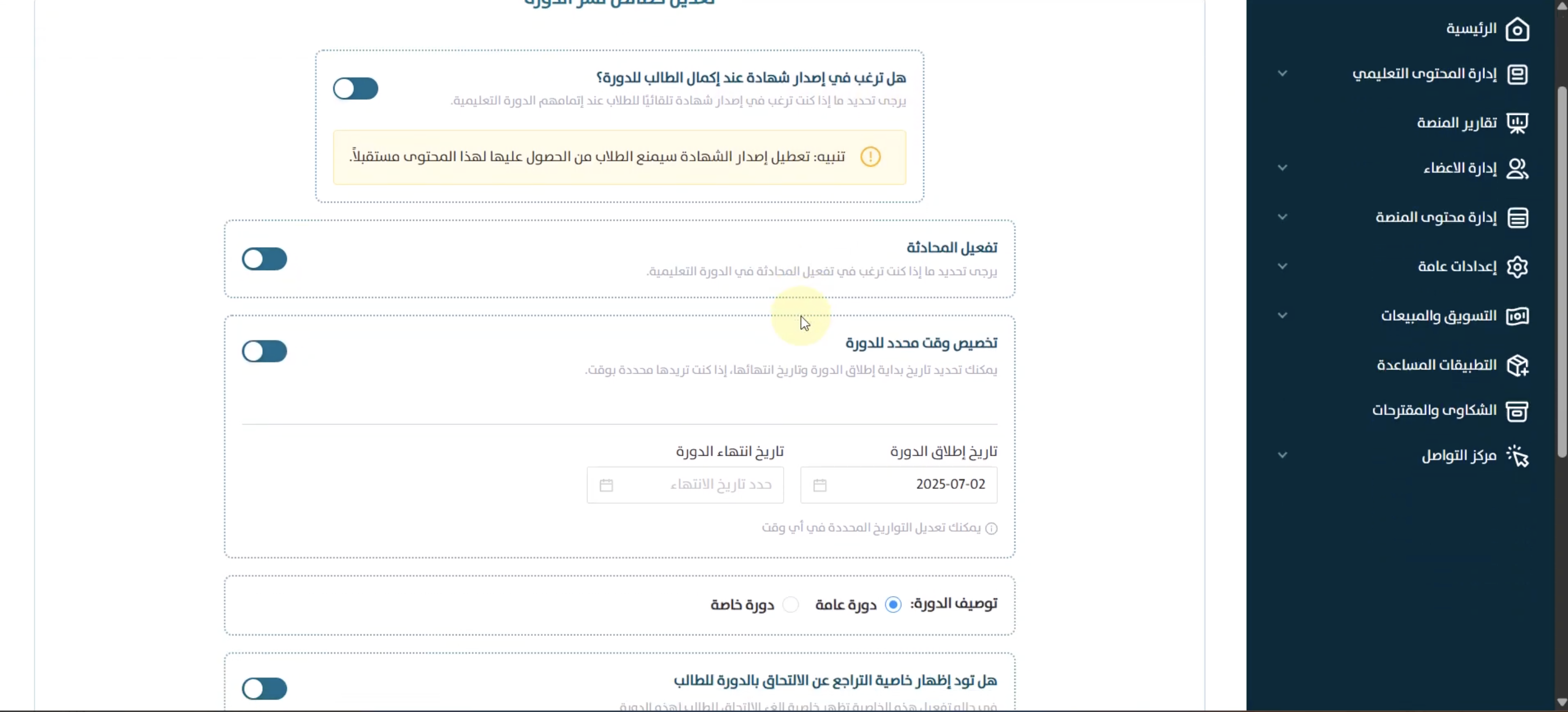 1- في قائمة لوحة التحكم بالصفحة الرئيسية للمنصة، اضغط فوق رابط «إدارة المحتوى التعليمي» > «الدورات» لتفعيل المحادثة (chat) في الدورة المختارة من خلال ( تعديل خصائص النشر).