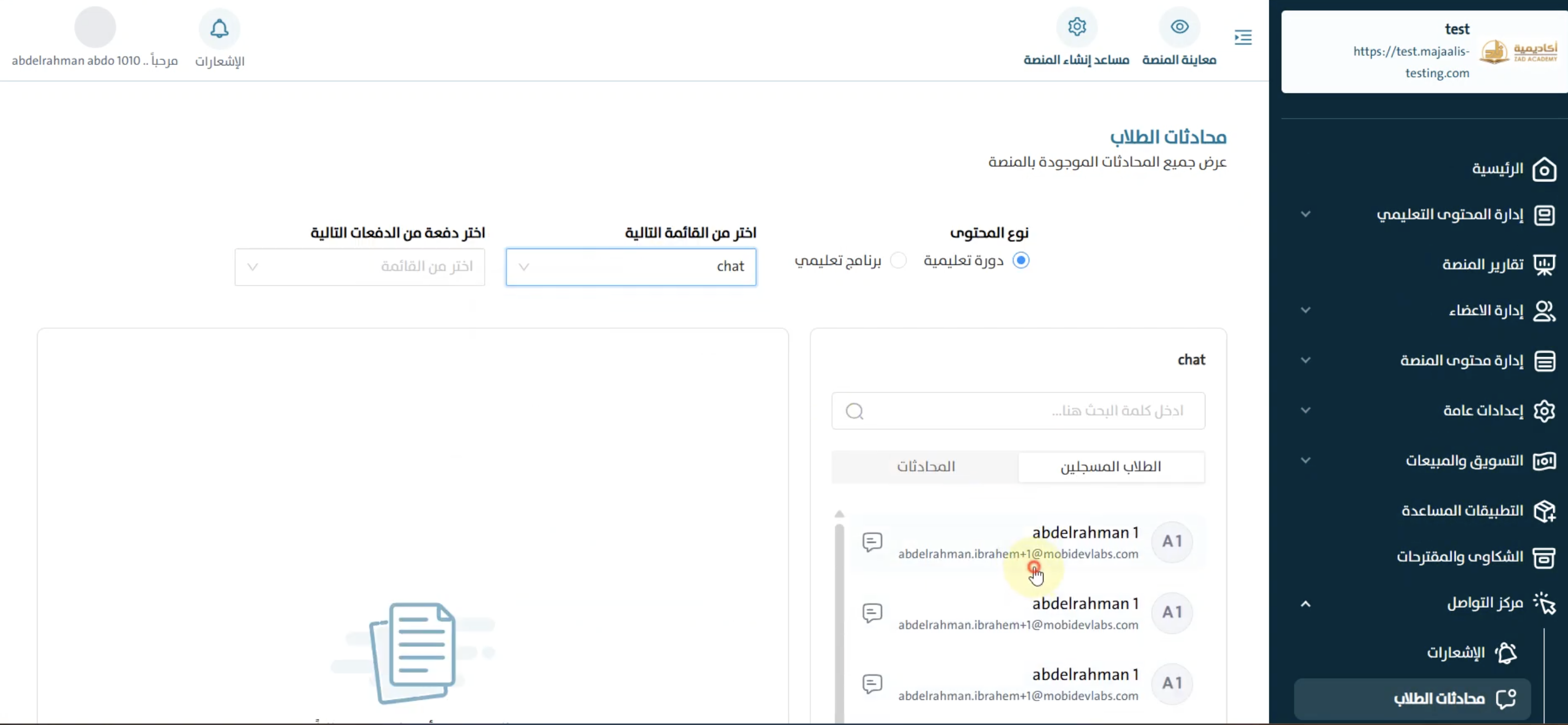 2- في قائمة لوحة التحكم بالصفحة الرئيسية للمنصة، اضغط فوق رابط «مركز التواصل» > «محادثات الطلاب» للانتقال مباشرة لصفحة محادثات الطلاب؛ حيث يكون معروضًا بشكل افتراضي كل محادثات الطلاب المضافة سابقًا في المنصة.