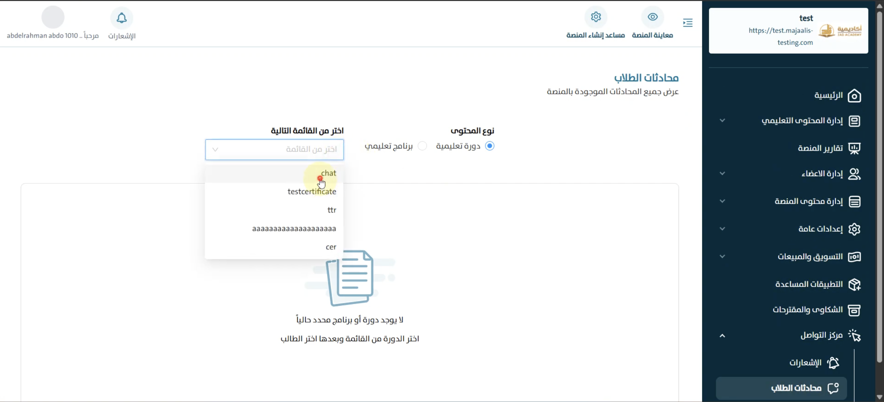 3- في صفحة محادثات الطلاب، اختر الدورة التي تريد محادثة الطلاب فيها.